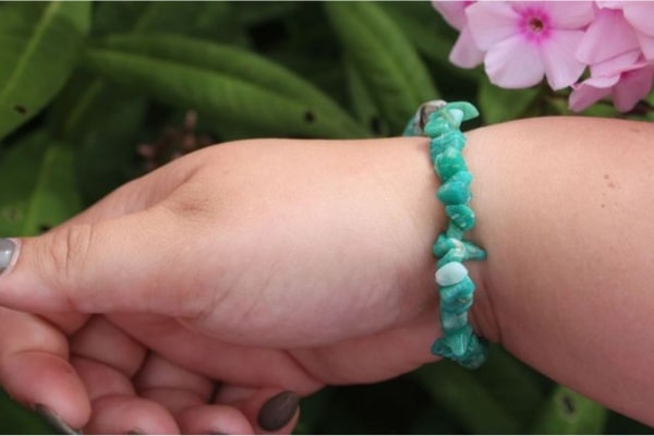 Mooie armband met Amazonietsplit, geregen op stevig elastiek.