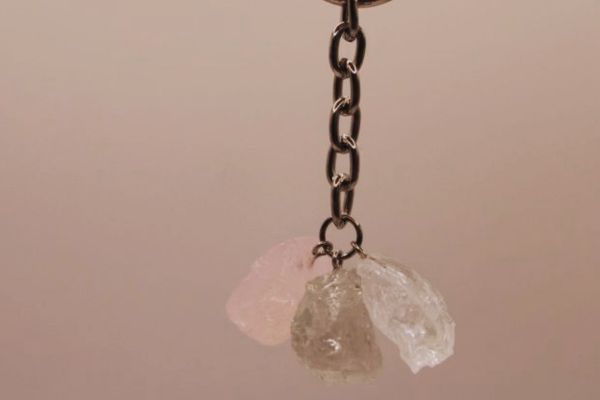 Sleutelhanger met ruwe brokjes Prasioliet, Rozenkwarts en Bergkristal.