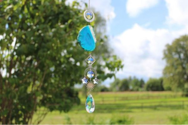 Decoratieve zonnevanger met man-made agaatschijfjes, glasprisma’s en zilverkleurige figuurtjes