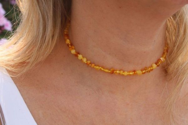 Barnstenen kettinkje met getrommelde barnstenen. De sluiting bestaat uit twee barnstenen die je in elkaar draait, zodat er geen irritatie ontstaat.