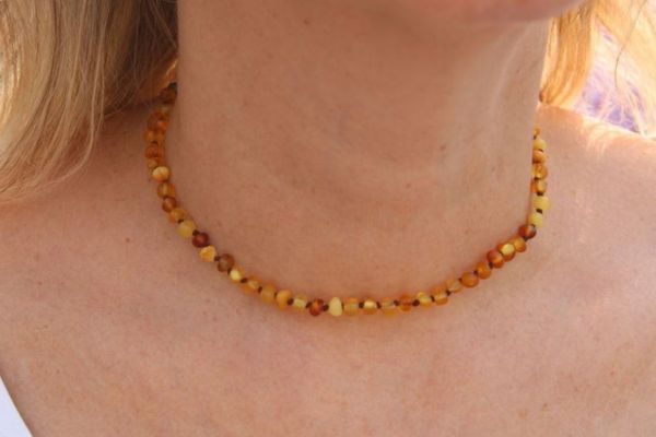 Barnstenen kettinkje met getrommelde barnstenen. De sluiting bestaat uit twee barnstenen die je in elkaar draait, zodat er geen irritatie ontstaat.