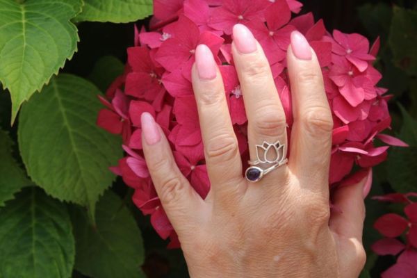 Deze prachtige, verstelbare 925 zilveren ring Lotus Amethyste bevat Amethist van AA-kwaliteit.
