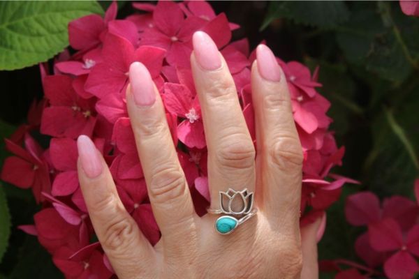 Deze prachtige, verstelbare 925 zilveren ring Lotus Turquoise bevat Turkoois van AAA-kwaliteit.